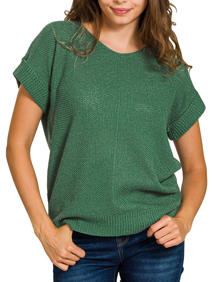 Transition to fall or spring in this light weight, short sleeve sweater in a beautiful, soft fabric.